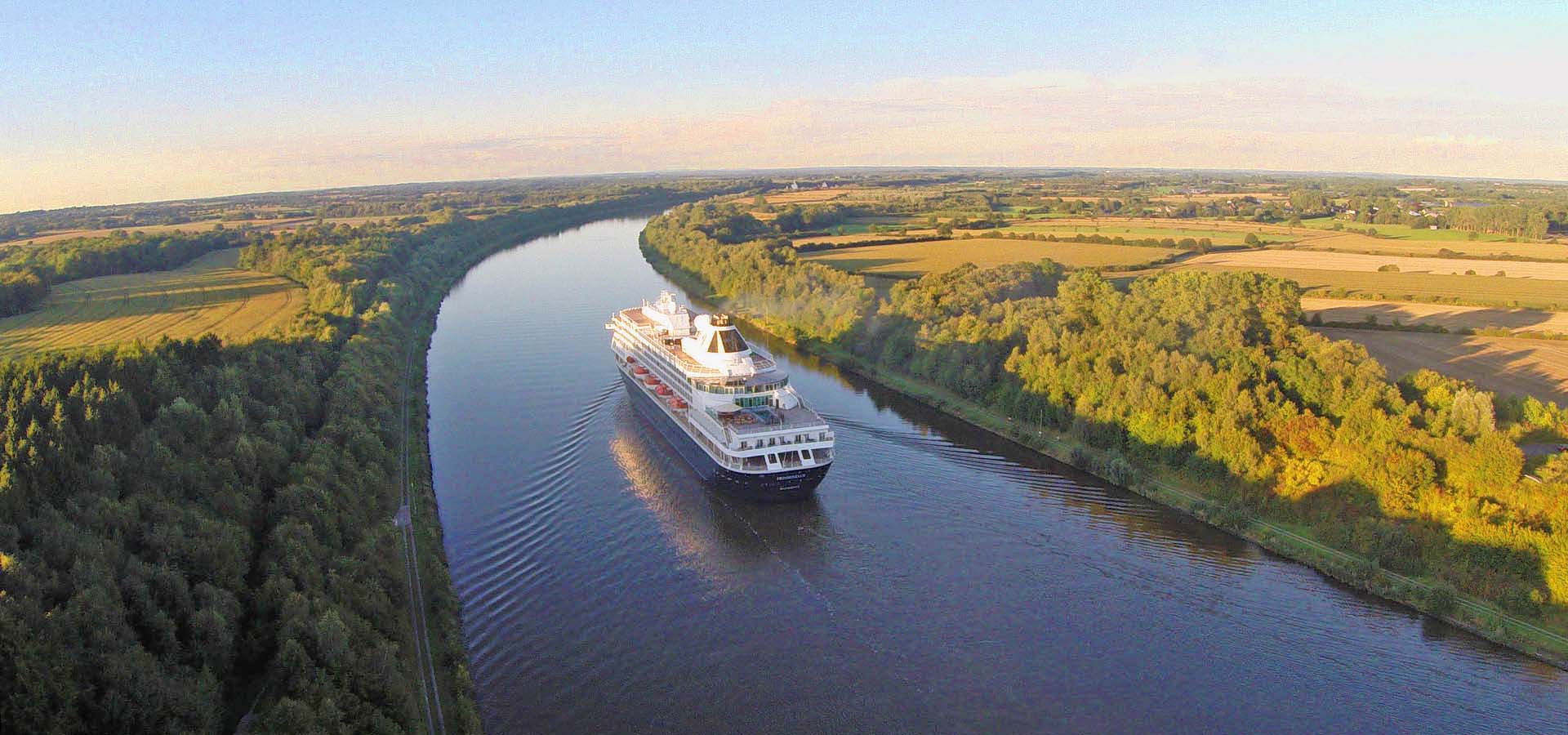 Drohnenflug über Ihre Urlaubsregion mit Traumschiff-Passage im Nord-Ostsee-Kanal.