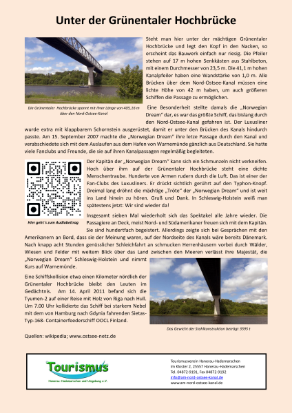 Wir stehen hier vor der Grünentaler Hochbrücke, die über denNord-Ostsee-Kanal führt. Sie nutzt einen Höhenzug, der jetzt vom Kanal durchschnitten wird und die Hohe Liedt genannt wird. Die Hohe Liedt war bereits in alter Zeit der einzige Übergang von Altholstein nach Dithmarschen, das durch Flüsse und Moore begrenzt wie auf einer Insel gelegen war. Sowohl der Handelsweg der Lübschen Trade zwischen Lübeck und Meldorf in Dithmarschen wie auch der westliche Ochsenweg mussten daher hier entlang führen.