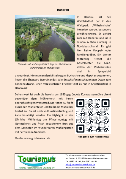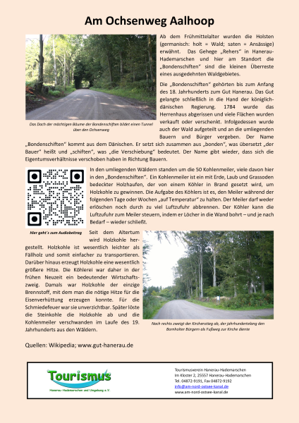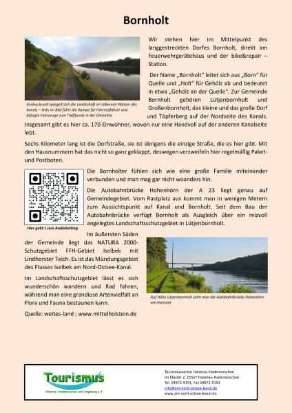 Der Ort Hanerau erfuhr erst ab 1799 mit dem Kauf des Rest-Gutes Hanerau durch Johann Wilhelm Mannhardt einen Aufschwung. Im Jahre 1803 bemühte er sich um eine Konzession zur Anlegung einer Ellenwarenfabrik in Hanerau. Dieses Unternehmen gliederte sich in Weberei, Strumpffabrikation, Spinnerei, Färberei und Bleiche. Sein soziales Engagement beeindruckt bis heute.Beim Bau des Nord-Ostsee-Kanals war anfangs auch in Bornholt eine Fähre geplant. Die Ufer an dieser Stelle sind jedoch sehr hoch, wie der steile Anstieg des Fahrradweges zeigt. Dadurch wäre der Bau einer Zufahrt zur Fähre für die damals noch von Pferden zu ziehenden landwirtschaftlichen Fahrzeuge recht schwierig gewesen. Der Kanal durchtrennte aber in seinem geplanten Verlauf viele landwirtschaftliche Flächen, so auch die der Bornholter Landbesitzer. Wegen der schwierigen Zuwegung zu einer Fähre an ihrem Ort verzichteteBornholt zwar auf die Fähre, jedoch nur gegen eine Entschädigung von 70.000 Reichsmark (Kanalzeitung 9.Sept.1894). Nach dem Bau des Kanals konnten sie nämlich ihre auf der anderen Seite des Kanals liegenden Felder nur noch über einen Umweg über die Fähre Hohenhörn oder die Grünentaler Hochbrücke erreichen. Mehr Informationen mit dem QR Code