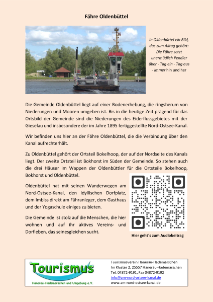 Sie stehen hier an der Fährstelle Fischerhütte, an der sie den Nord-Ostsee-Kanal mit einer modernen Fähre mit Diesel-Motor oder – falls sie gerade hier eingesetzt wird – mit noch modernerem Hybridmotor überqueren können.